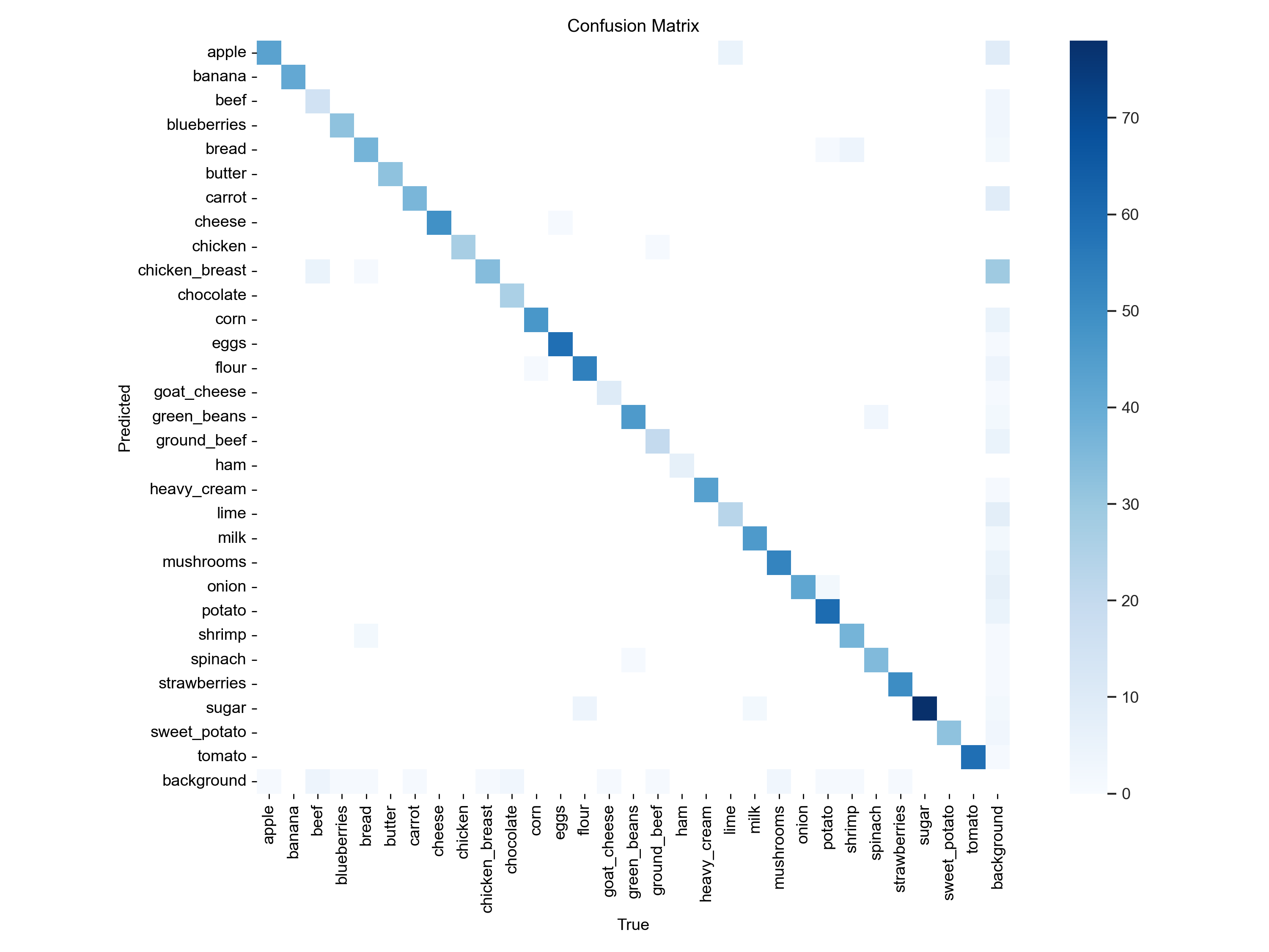 image 35/51 aup-ai-tutorials\train\aicook-4\test\images\DSC_6099_JPG_jpg.rf.3039514604f0ad81210a752a39882524.jpg: 800x800 1 apple, 1 blueberries, 1 bread, 1 carrot, 1 chicken, 2 chicken_breasts, 1 corn, 1 eggs, 1 flour, 1 ground_beef, 1 milk, 1 sugar, 113.5ms